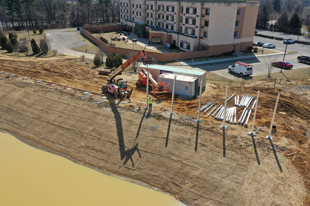 Extreme Builders was contracted for this project for the Westampton Logistics Center. The project had two phases. Phase One included two walls: one near the main entrance to block sound for a nearby hotel, and one L-shaped wall in the back right corner of the site. Phase Two was an addition to the wall at the back.
